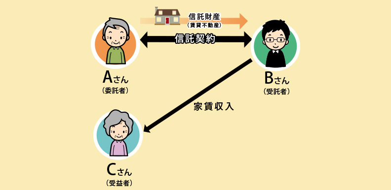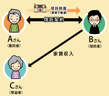 例えば、高齢になり将来の財産管理に不安を持つAさん(委託者)が、所有している賃貸不動産の管理を息子のBさん(受託者)に任せ、その家賃収入をAさん自身(受益者)が受け取るというようなケースが家族信託になります。