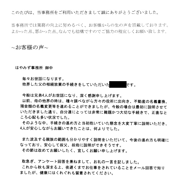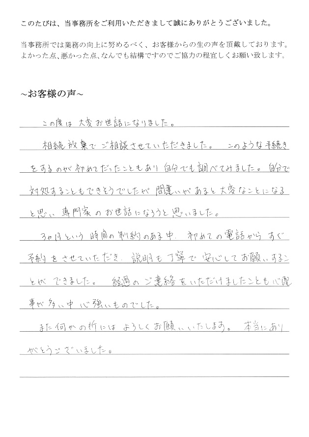 他界した父の相続放棄の手続きをしていただいた●●です。